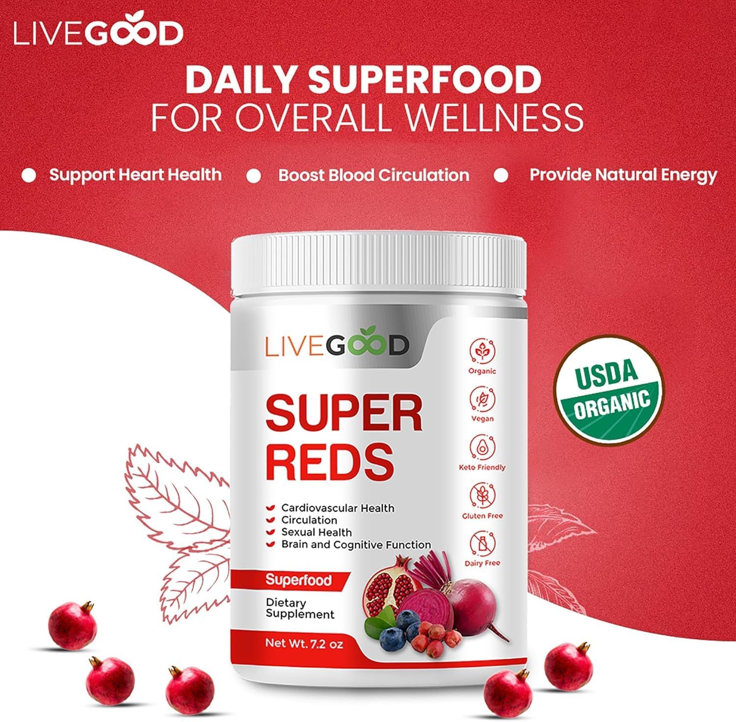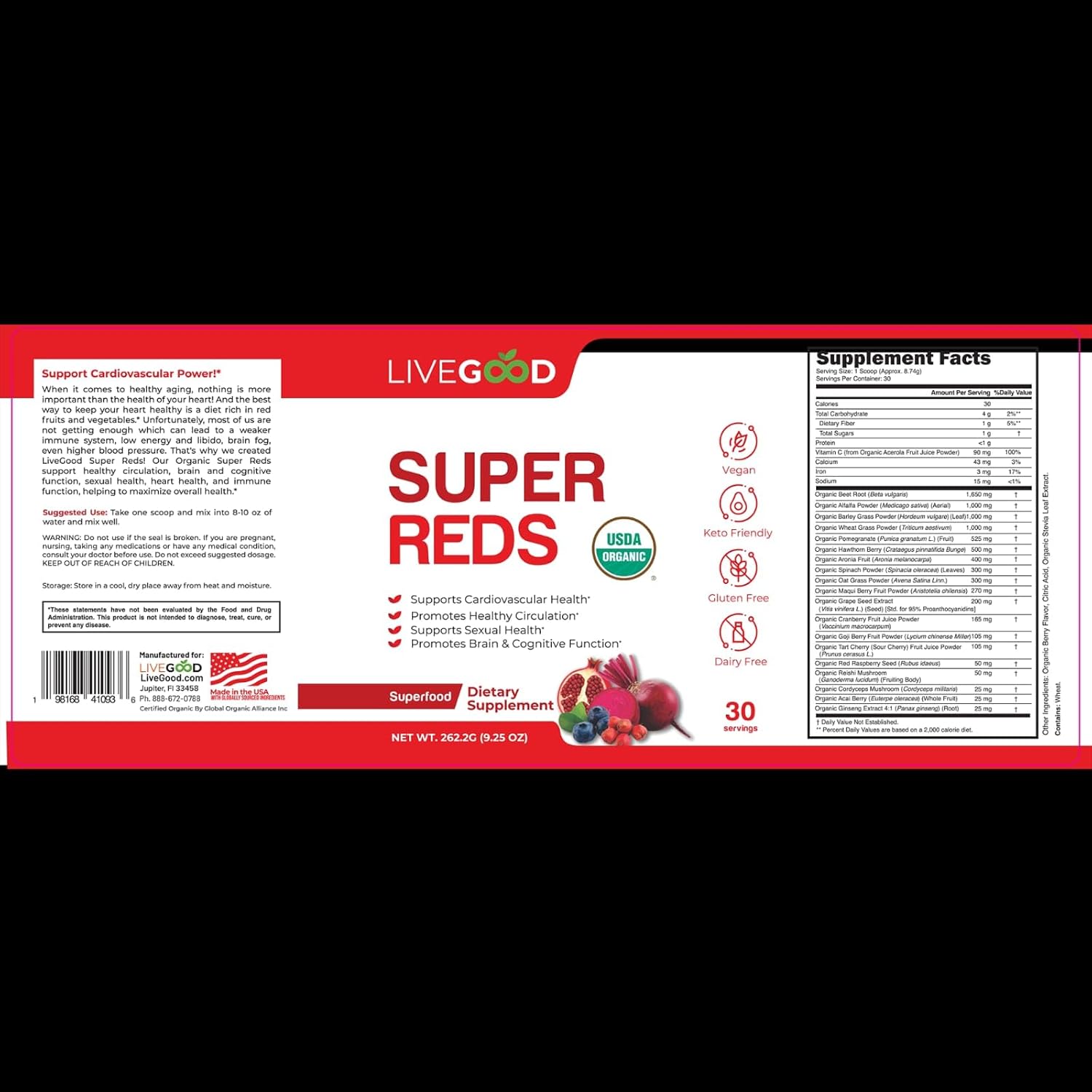 - ORGANIC SUPPLEMENT: USDA certified organic formula contains a powerful blend of red superfoods to support cardiovascular health and circulation