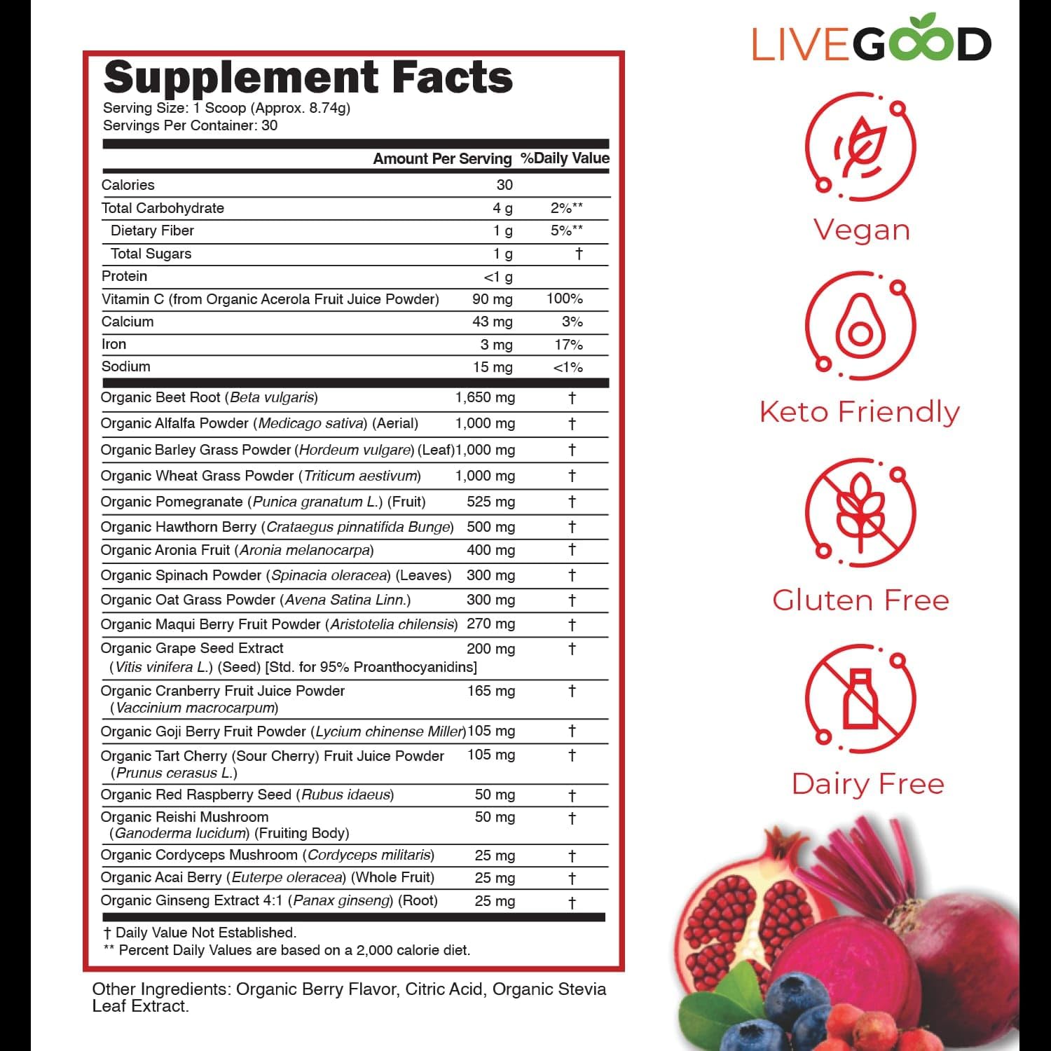 LIVEGOOD™ Organic Super Reds with Alfalfa, Barley Grass, Beet Root, Pomegranate, Grapeseed, Vegan, Gluten Free, 7.2 oz.